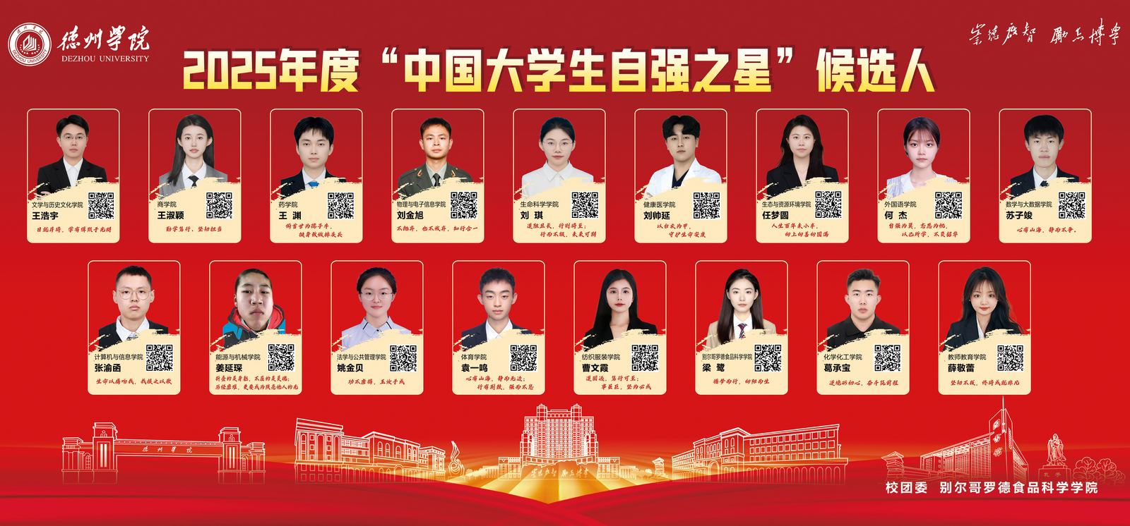 本次评审严格围绕“思想政治表现、典型事迹报道、示范引领作用、现场汇报表现”四个方面展开,既注重考察候选人的思想觉悟与价值追求,也强调其事迹的真实性、感染力及对广大学生的示范带动作用。经过激烈角逐与严谨评审,最终确定能源与机械学院姜延琛、物理与电子信息学院刘金旭、化学化工学院葛承宝、别尔哥罗德食品科学学院梁鹭等17名同学荣获“德州学院大学生自强之星”称号。其中,姜延琛同学被推荐参加2025年度“中国大学生自强之星”全国评选。
