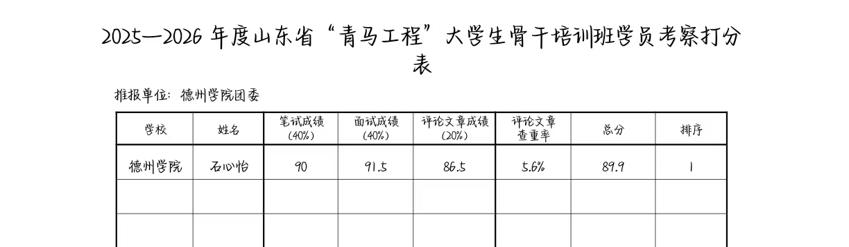 根据《关于2025-2026年度山东省“青马工程”大学生骨干培训班招生计划的通知》,经过自愿报名、资格审查、比选择优(包括笔试、综合面试环节、个人业绩评价等环节)、组织考察等程序,最终确定文学与历史文化学院23级新闻学专业的石心怡作为关于2025-2026年度山东省“青马工程”大学生骨干培训班的拟推荐学员,提交到团省委进行最终复核。